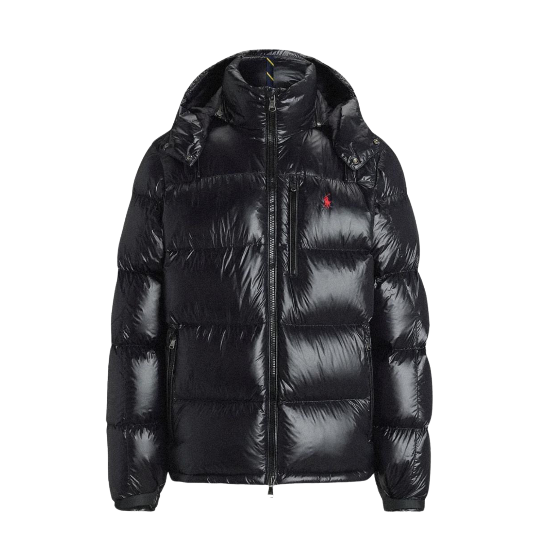 This is a classic black puffer jacket with a full-zip front and a hood. The jacket has a small, embroidered red Polo Ralph Lauren pony logo on the chest. It also features a zippered chest pocket and two zippered side pockets. This is a timeless and functional piece for cold weather.